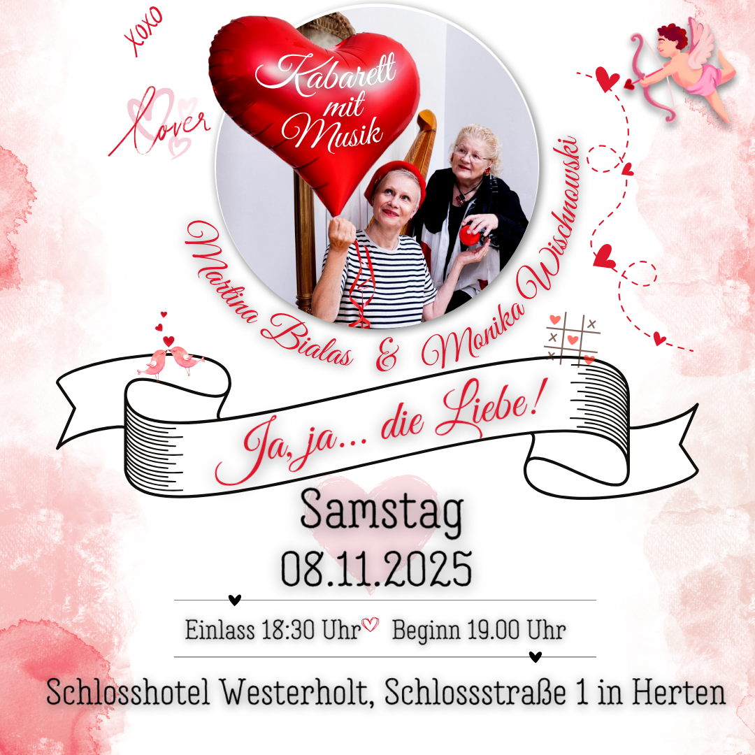 🎭 Kabarettabend im Schlosshotel Westerholt – „Ja, ja… die Liebe“ mit Martina Bialas & Monika Wischnowski Ein Kabarett voller Humor, Musik und Herz – am 08. November 2025 im Schlosshotel Westerholt Freuen Sie sich auf einen besonderen Kabarettabend in stilvollem Ambiente: Am Samstag, den 08.11.2025, präsentieren Martina Bialas und Monika Wischnowski ihr neues Programm „Ja, […]